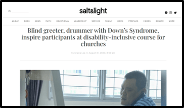 1 September 2020: “Blind greeter, drummer with Down’s Syndrome, inspire participants at disability-inclusive course for churches”, Salt & Light, Sep 1, 2020