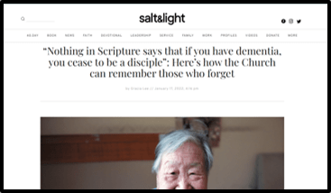 17 January 2022: “Nothing in Scripture says that if you have dementia, you cease to be a disciple”: Here’s how the Church can remember those who forget”, Salt & Light, January 17, 2022.