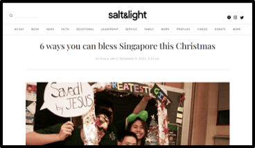 09 December 2022: “6 ways you can bless Singapore this Christmas”, Salt & Light, December 9, 2022.