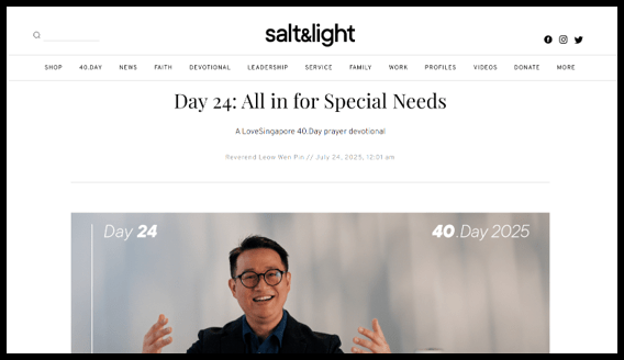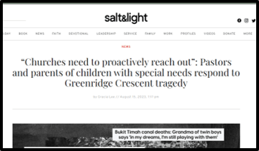 15 August 2023: “‘Churches need to proactively reach out’: Pastors and parents of children with special needs respond to Greenridge Crescent tragedy”, Salt & Light, August 15, 2023.
