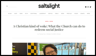 18 October 2024: “A Christian kind of woke: What the church can do to redeem social justice”, Salt & Light, October 18, 2024.