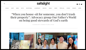 29 October 2024: “‘When you house-sit for someone, you don’t trash their property’: Advocacy group Our Father’s World on being good stewards of God’s earth”, Salt & Light, October 29, 2024.