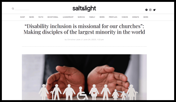 24 June 2025: “‘Disability inclusion is missional for our churches’: Making disciples of the largest minority in the world”, Salt&Light, June 24, 2025.