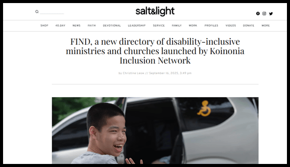 17 September 2025: “FIND, a new directory of disability-inclusive ministries and churches launched by Koinonia Inclusion Network”, Salt&Light, September 17, 2025.
